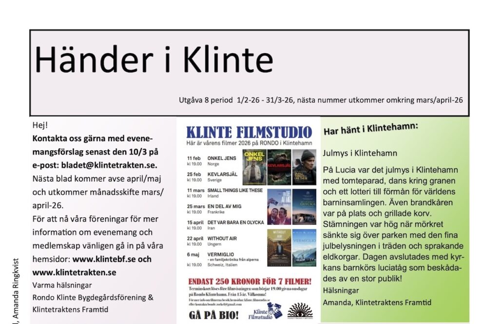 Här kan du läsa första utgåvan av Händer i Klinte, bygdens evenemangsblad som kommer att hålla er informerade om aktiviteter och evenemang i vår närmiljö. Klicka på bilderna för att läsa, eller ladda ner bladet som PDF.
